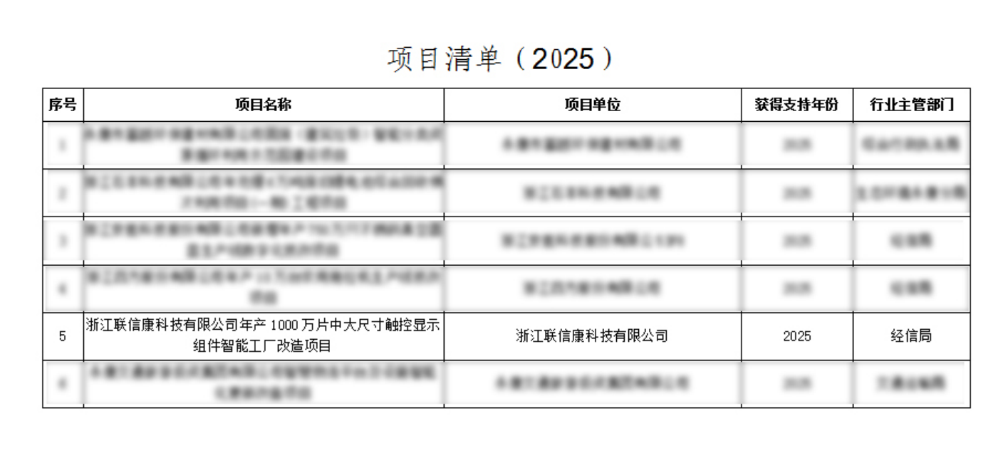 近日,浙江联信康科技有限公司报送年产1000万片中大尺寸触控显示模组智能工厂改造项目成功入选2025年度《工业重点行业领域设备更新和技术改造》两新项目支持计划,并获得专项资金支持共计1031万元